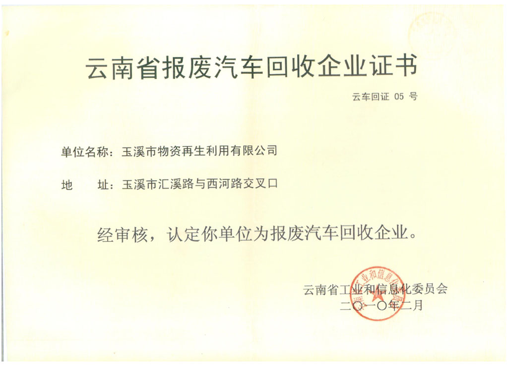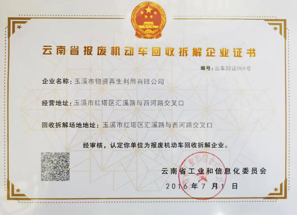 玉溪市物資再生利用有限公司自成立以來,嚴(yán)格按照國務(wù)院307號令《報廢汽車回收管理辦法》的要求進行報廢汽車回收、拆解、銷售;積極配合工商、公安、車管等部門,做好報廢汽車的監(jiān)督銷毀工作。在各級部門的大力指導(dǎo)下,合法經(jīng)營,取得了一定的經(jīng)濟效益和社會效益。