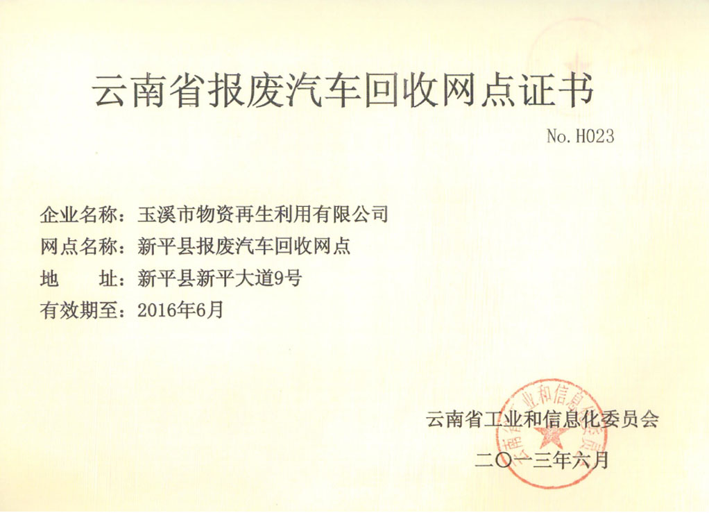 Axq全國車輛報廢解體辦理中心|車輛報廢解體|車輛補貼|車輛回收|車輛注銷Axq全國車輛報廢解體辦理中心|車輛報廢解體|車輛補貼|車輛回收|車輛注銷Axq全國車輛報廢解體辦理中心|車輛報廢解體|車輛補貼|車輛回收|車輛注銷 玉溪市物資再生利用有限公司成立于1995年12月21日,注冊資5000萬元,經(jīng)營面積39660平方米。公司下設(shè)回收網(wǎng)點1個,現(xiàn)有職工42人,其中各種專業(yè)技術(shù)人員10人。是玉溪市很早一家具有報廢汽車回收拆解資質(zhì)的報廢汽車回收拆解企業(yè)。